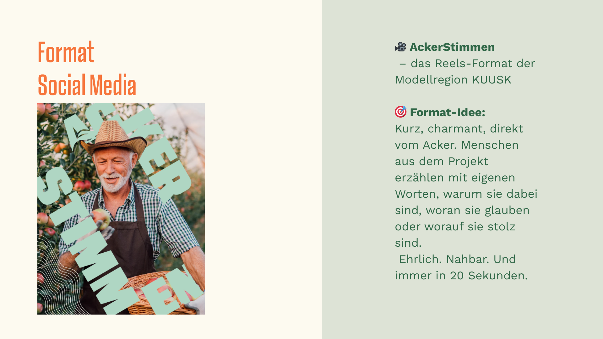 Content-Formate: Entwicklung von Untermarken wie AckerStimmen (Reels) und AckerDemie (Schulprojekte), die Themen anschaulich und zielgruppenorientiert transportieren.